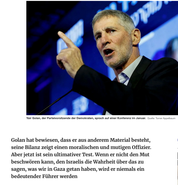 Golan war während des Krieges kein Kommandeur, aber er wusste sicherlich, was passierte. Einmal Offizier, immer Offizier – es ist schwer, den kompletten Übergang in das zivile Leben zu schaffen. Aber das ist Golans Mutprobe. Wenn er nicht den Mut aufbringen kann, den Israelis wahrheitsgemäß zu sagen, was wir in Gaza getan haben, wird er niemals eine bedeutende Figur werden.