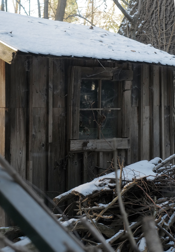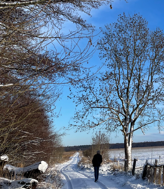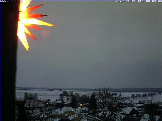 Man sieht hier den Weg rechts zur Trebel. Oben die Lichter am Tisch unten und Oben im Giebel.