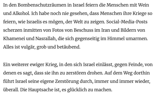 Israels zerstörte Gesellschaft hat sich bisher gut dagegen gewehrt. Auch die Luft- und Zivilschutzsysteme haben hervorragend funktioniert. Sie verdienen unseren Dank und unsere Wertschätzung mehr als die Piloten, die die Bombardierung machen.