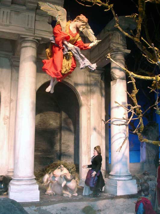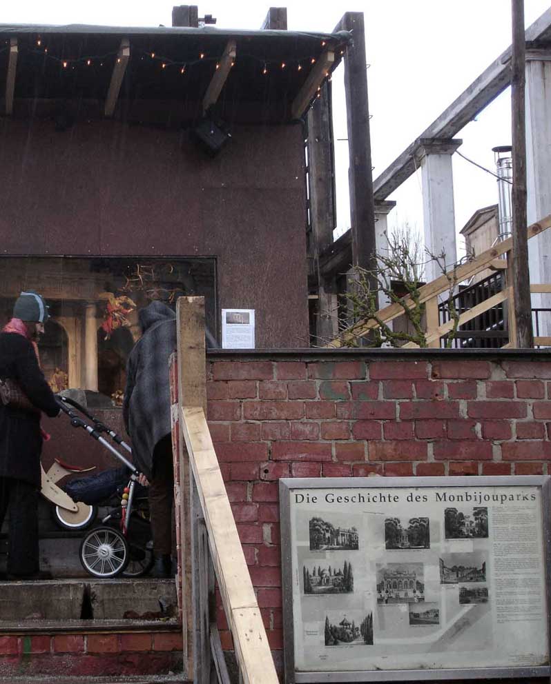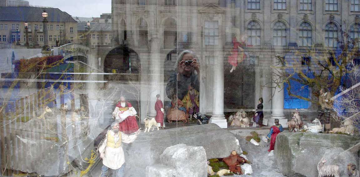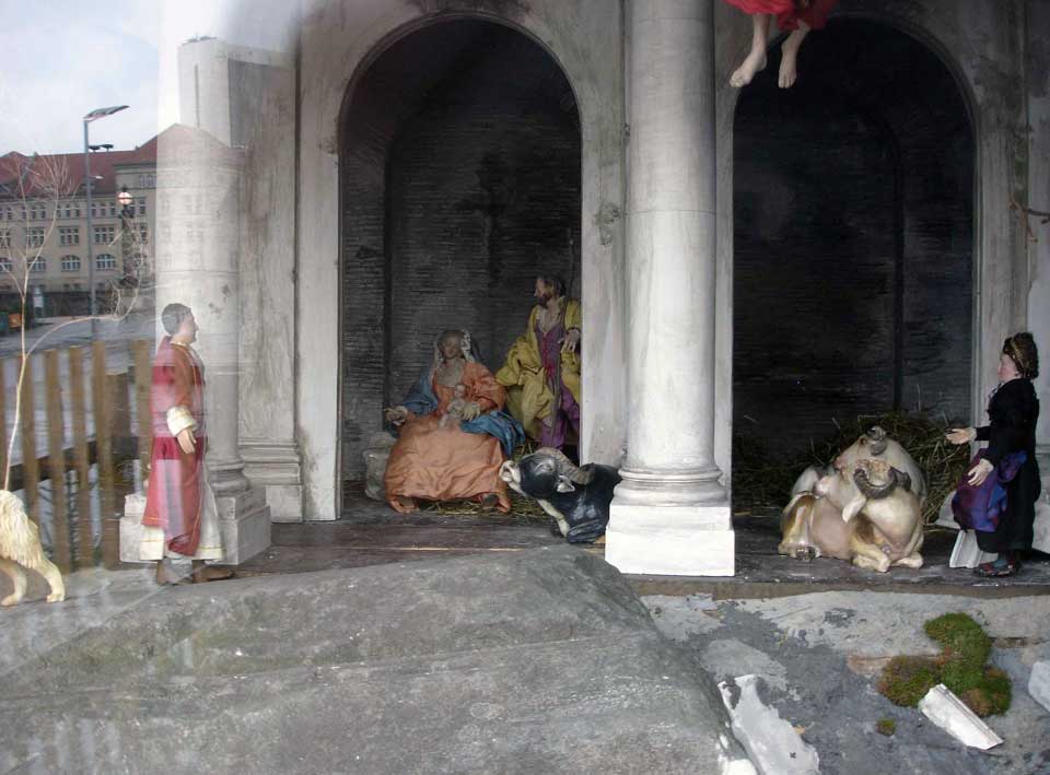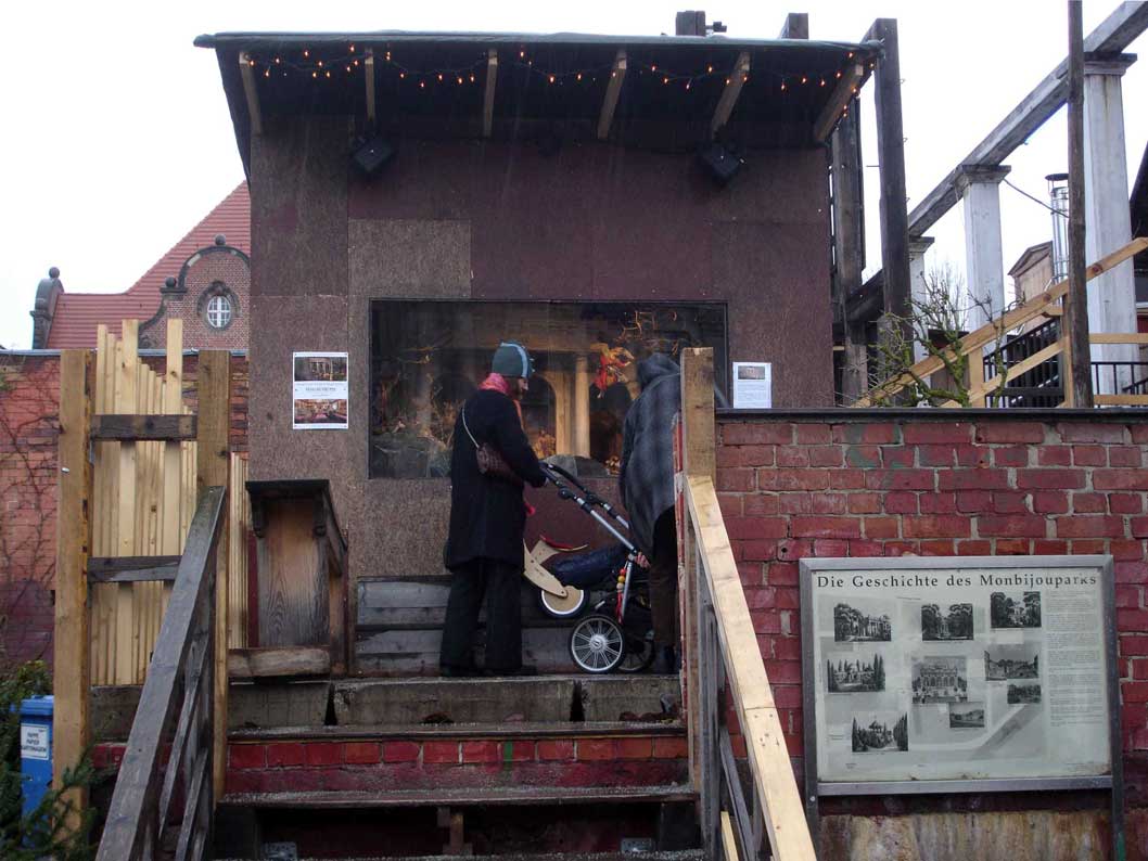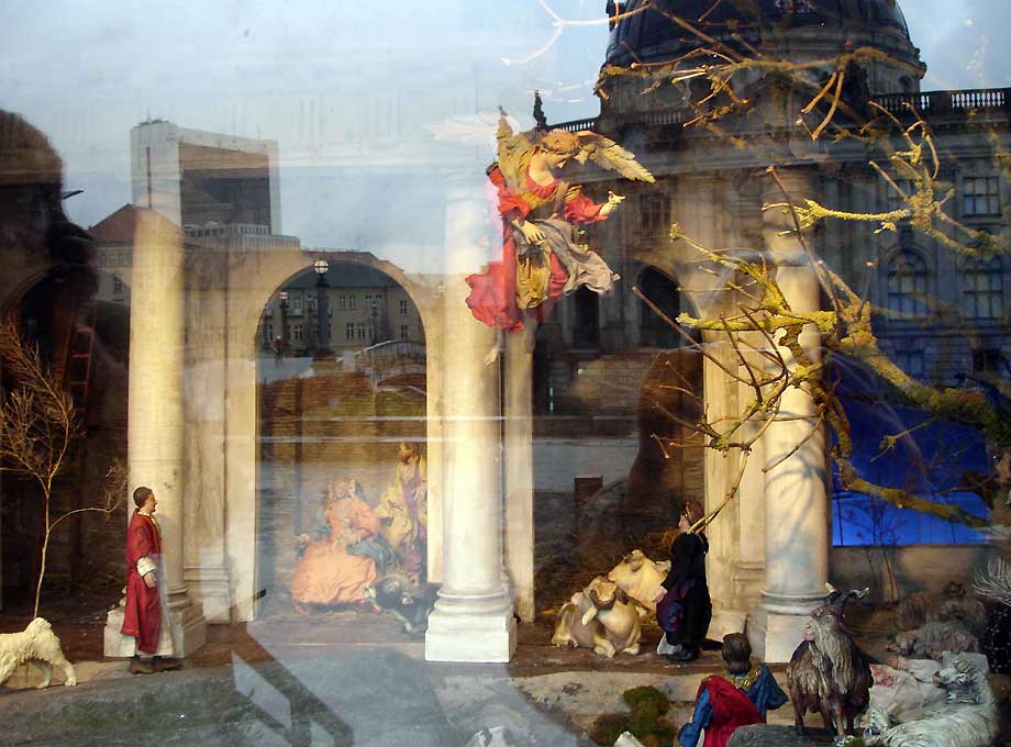 Berlin, am Ort des ehemaligen Schloss Montbijou die neapolitanischen Krippenfiguren auf gefundenen Teilen des Schlosses und im Modell des wiederhergestellten Schlosses eine Krippe versuchend. Das Bode-Museum immer gegenüber und die Hütte der Märchen aus Polen nebenan.