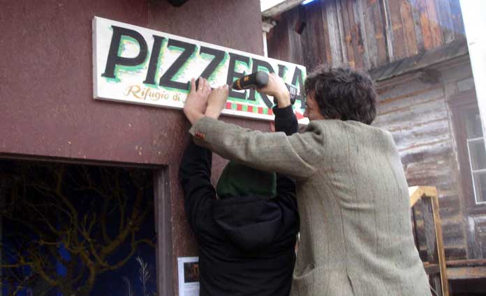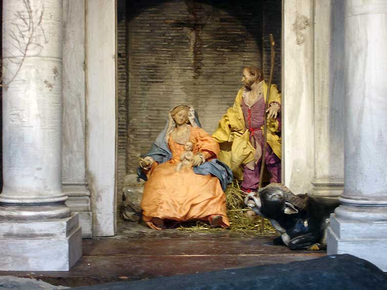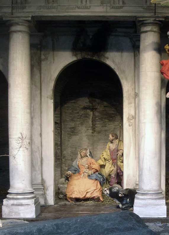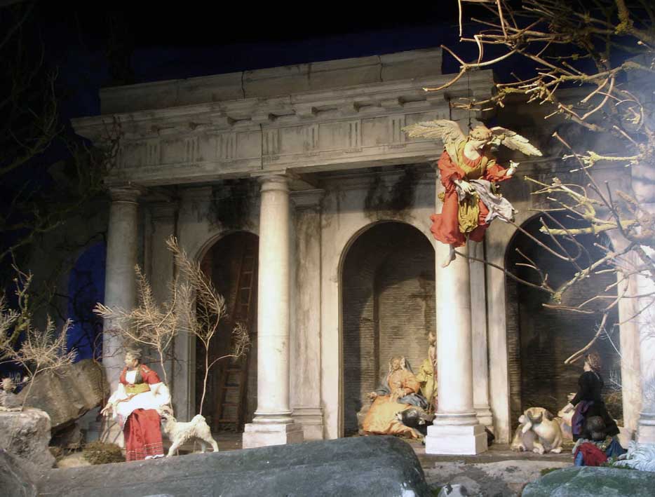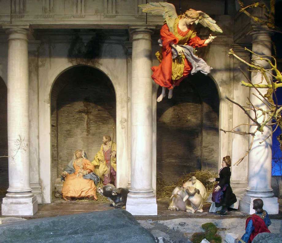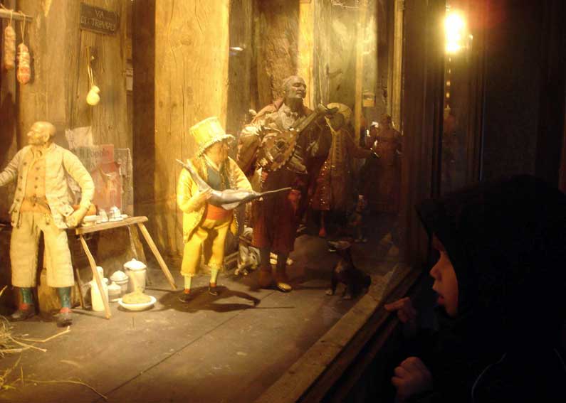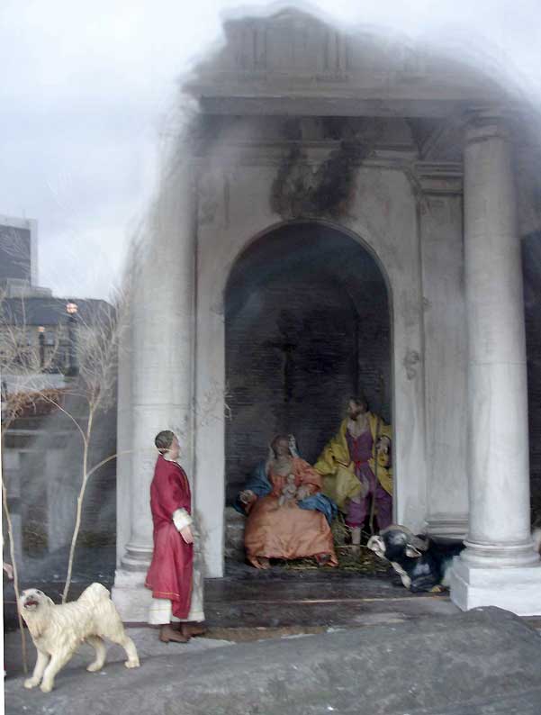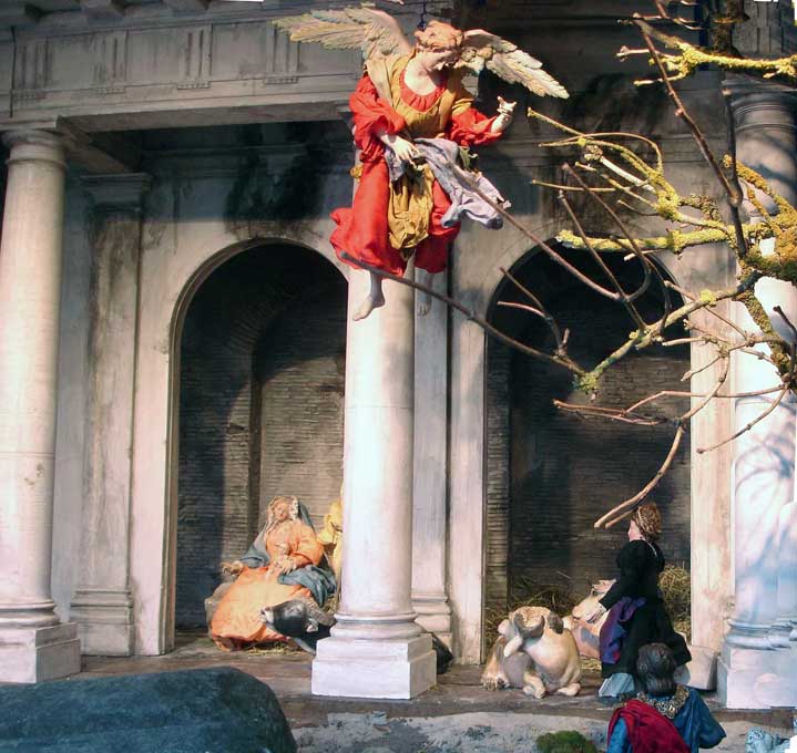 Berlin, am Ort des ehemaligen Schloss Montbijou die neapolitanischen Krippenfiguren auf gefundenen Teilen des Schlosses und im Modell des wiederhergestellten Schlosses eine Krippe versuchend. Das Bode-Museum immer gegenüber und die Hütte der Märchen aus Polen nebenan.