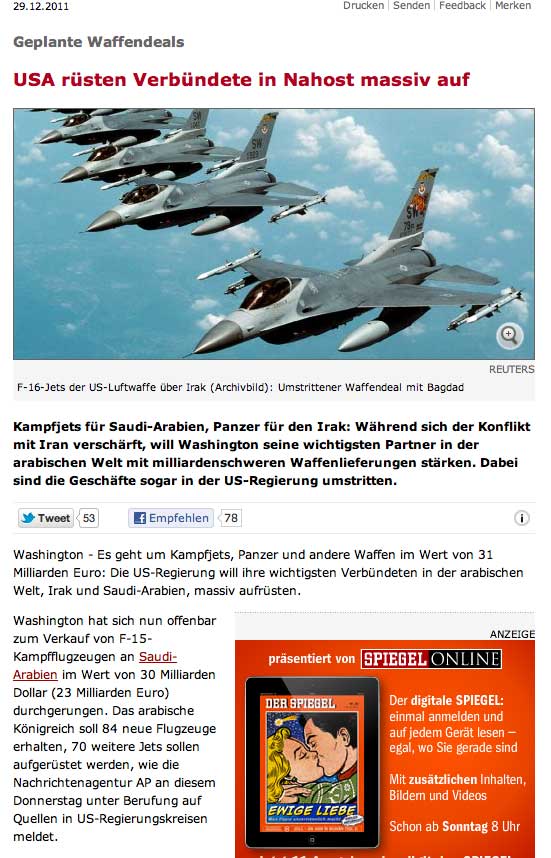 Bereits vor rund einem Jahr hatte der US-Kongress einem auf zehn Jahre angelegten Rüstungsgeschäft mit Saudi-Arabien im Wert von 60 Milliarden Dollar zugestimmt. Darin enthalten war der Verkauf von F-15-Flugzeugen, Hubschraubern, verschiedener Raketen, Bomben sowie Radarwarnungssystemen und Nachtsichtgeräten. Es hatte aber politischen Streit wegen des Deals gegeben: Einige Abgeordnete stimmten dem Geschäft erst zu, nachdem ihnen versichert wurde, dass es keine Bedrohung für die militärische Überlegenheit Israels in der Region darstelle.