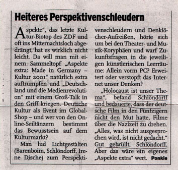 Noch vor dem Film dann 1994. Es war das eine Darstellung eben jenes Schweigens, das auch die Vertreibung aus dem Osten von 15 Millionen Menschen mit einschloss, in dem Verlust der1/5 des Landes und der Raub, den sie Enteignung nennen, Fluch des Revanchismus einhandelnd jedem, der wagte davon "relativierend" über unsere Schuld zu sprechen. Erfreut, einen aus der Ferne mutig den Bann sprengen zu sehen, einen Alliierten zu finden, wurde der Film nun, Ein Traum, was sonst? an ihn geschickt,ohne Antwort. Bis zum traurigen Entschluss sowas nicht herumliegen lassen zu wollen und der Bitte um Rückgabe, dass das Band nun zurückkam, wie oben, ohne persönlich beschriftete Hülle, ohne Absender und ohne ein Wort. Ein deutscher Schriftsteller nach dem letzten Kriege.