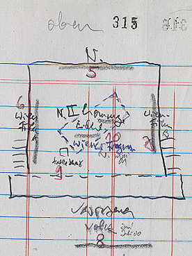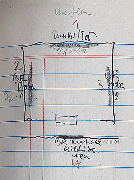 Rossini). An der Eingangseite, auf der (4) vierten Wand nochmal BE Proben, aufgenommen in der Matinee für E.Schleef am 11.11.01, ergänzt durch Aufnahmen aus dem Wilden Sommer (Goldoni) in Wien (Burgtheater). |