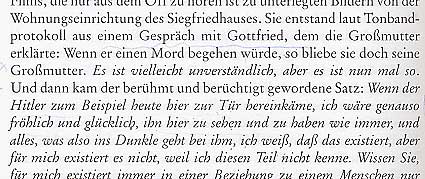 Der Reihe nach. Zunächst einmal ist der Satz nicht ganz getreu dem Protokol des Tons entsprechend zitiert. Ich schickte nach einem Telefongespräch im Frühjahr, die entsprechende Abschrift. Aber da war das Manskript vielleicht schon im Druck. Gerade die hier ausgelassenen zögerden so's vor dem glücklich verraten dem Regie- und philologisch geschulten Ohr etwas über den Menschen, der sich da darstellt und sein verhältnis über die Person, über die er spricht. Darauf machte ich dabei aufmerksam. Das sind die Folgen, wenn man Protokolle eine Gottfried W.-wie hier offenbar-verwendet. Sie sind unpräzise, wenn nicht schlimmer. In der Auskunft der herkunft.