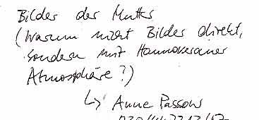 ch der Gespräche, zum ersten Mal in dem rekultivierten Neuhardenberg, einziges Thema und Motiv erster Überlegungen für den Raum, den ich zu machen eingeladen war. Kombiniert mit den Chören Schuberts (Tod und das Mädchen und der Wanderer, plus Der Mond ist aufgegangen), wie in der Matinee des BE gerade vorgeführt und aufgenommen, -abgebrochen von Schleef im Januar 01 vor dem Tode. Als das dann Vor-weg-genommen war in den Kestner Gesellschaft Hannover jetzt im Juni vor Neuhardenberg im August/September, kam ich auf neue Spuren des Ende im nachfolgenden Abbruch der Nietzsche Triologie in Wien(Nietzsche-Projekt Mai Juni), das dann nicht mal zu Proben führte, aber Pläne, Skizzen hinterliess. Immer näher kam ich an ihn und dessen, was er nicht mehr tun konnte.