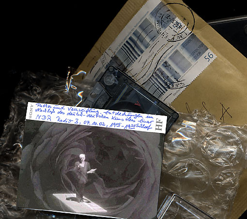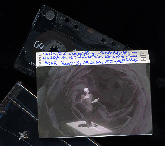 Nietzsche angeeignet , ohne Wagner, PARSIFAL. Zum letzten Liebesmahle dieser ECCE HOMO und hetzende Hunde Schleefs aus dem Raum, Töne aus den Apparaten , Archiven entfernt, sich angeeignet. Zweimal fällt der Name G.A. der alte Freund und Dramaturg in Frankfurt, Berlin, aus den Tagen der Monologe, 1o Jahre, Mittäter jetzt, Alliierter damals. Und Bruder des Kurators. Gertrud von der Bühne/EC ,unsendbar, hinzugefügt, entstellt, verstümmelt, gestrichen, was er geschrieben,sie gesprochen. Enteignet . Verstümmelt, zu eigen gemacht. Auf ihr Niveau gebracht. Alle Orte des Lebens-Uhr , der Kindheitslandschaft gleich zu Anfang, raus.