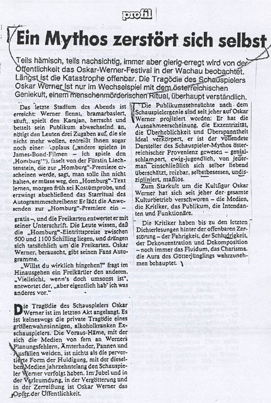 ein Sechzig-Minuten-Monolog von Oskar Werner gesendet ("Ich durfte am Tisch der Götter sitzen") in seiner vom Alkohol gezeichneten Existenz, so wie er ein halbes Jahr vor seinem Tode erschien. Immer wenn