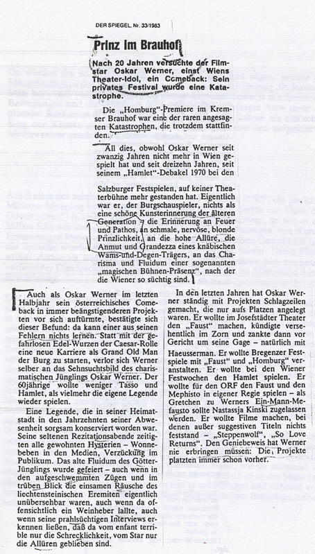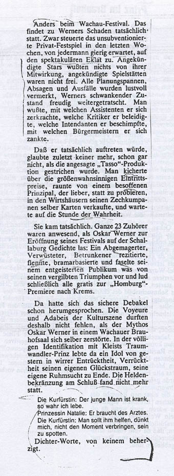 ungeübte Kunst. Kortner brauchte die anderen am Ende, um sich darzustellen, und Oskar Werner wagte den Schritt in seinem letzten, realisierten Abschied des monologischen "Homburg" nur mit Hilfe anderer um ihn