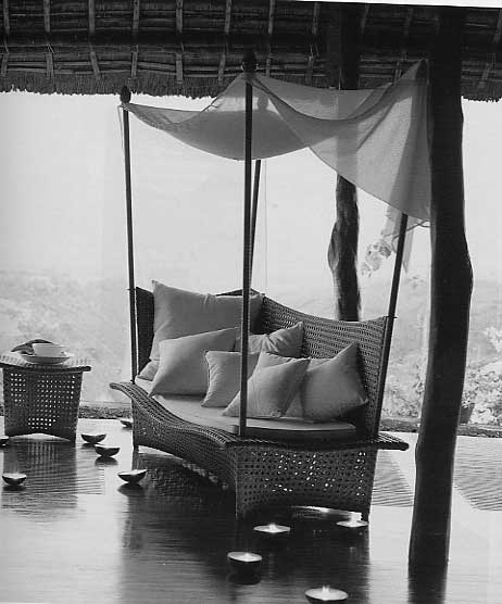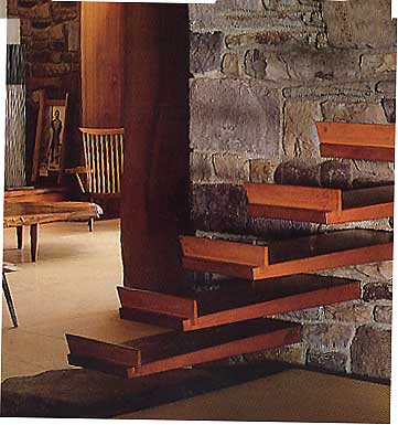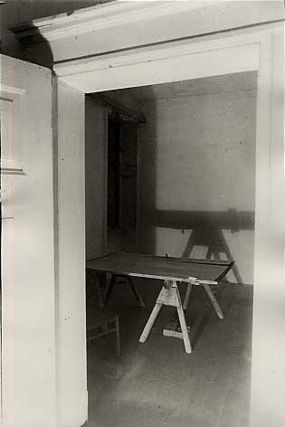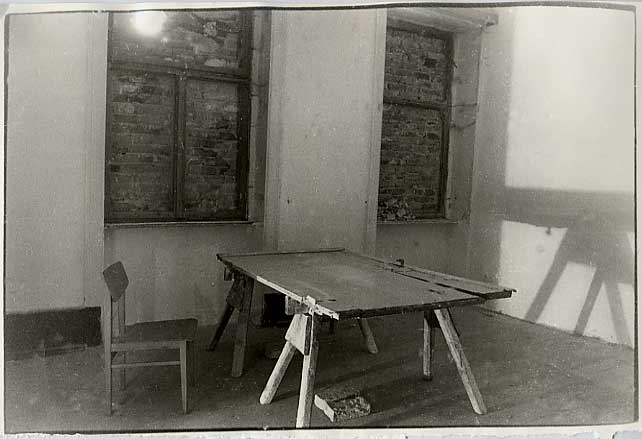 Wände und ein Loch für den Ofen. Tisch und Stuhl. Und die Liege ist