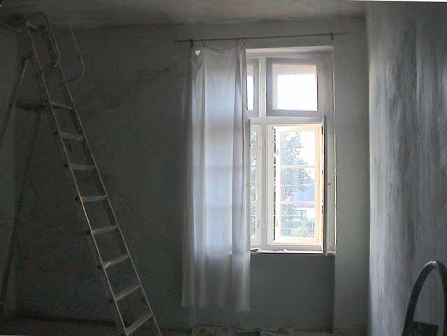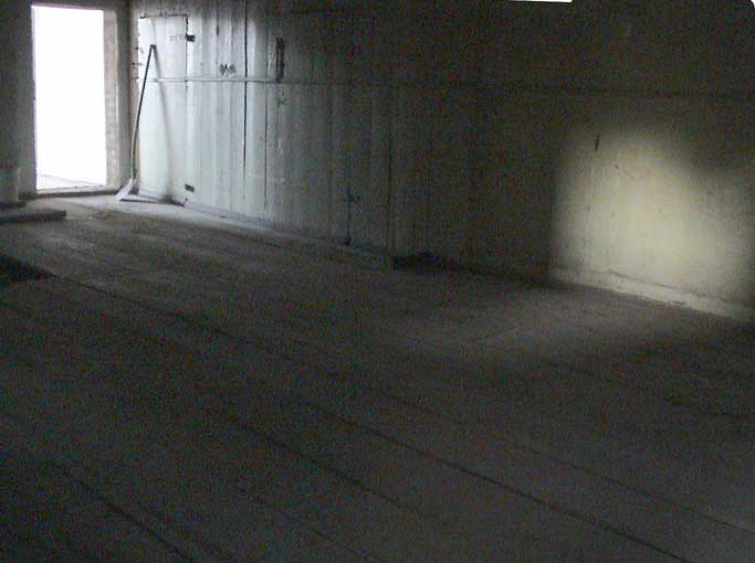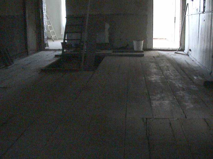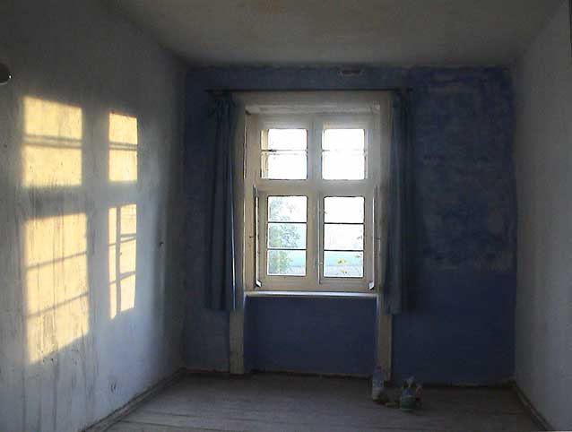 Oben die verbrannte Diele bekam einen neuen Boden mit den Brettern aus dem Kloster Broda /Neubrandenburg. Und die DDR-Gaube wurde durch eine Dachluke ersetzt, dort, wo es zum Bad ging des Kindes und bis zuletzt nass reinkam noch in der Nacht zuvor. Alle Räume rundum atmen auf..Meine ich. man müsste es sehn. Alles in einer Woche. Die rehenrinnen dazu und die Fassade rechts wieder heil.