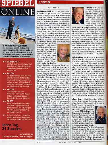 wöchentlichen Liste der Toten im SPIEGEL erhält Leni Riefenstahl, die im Leben