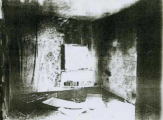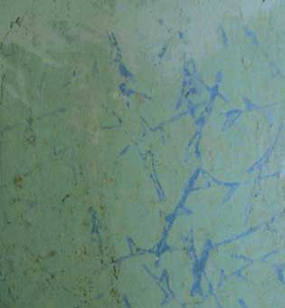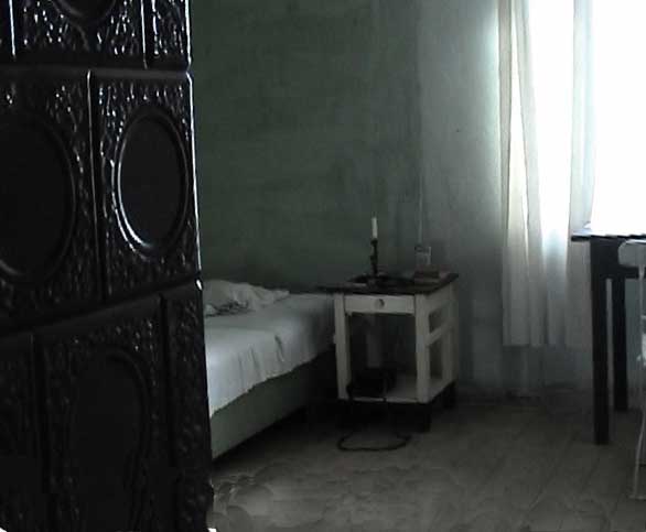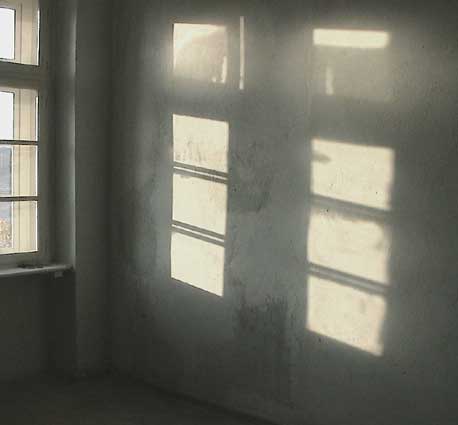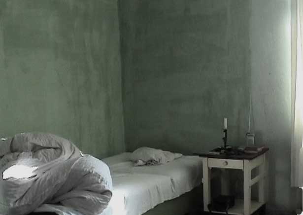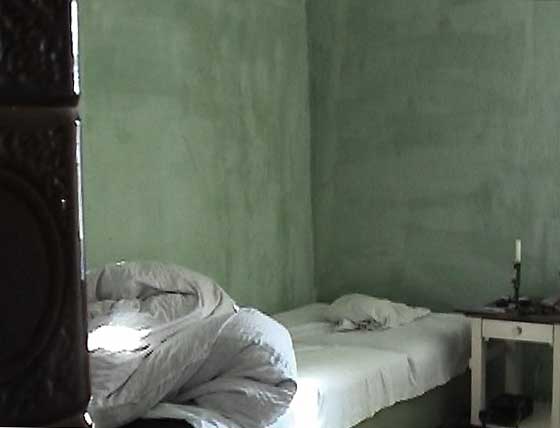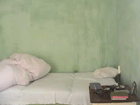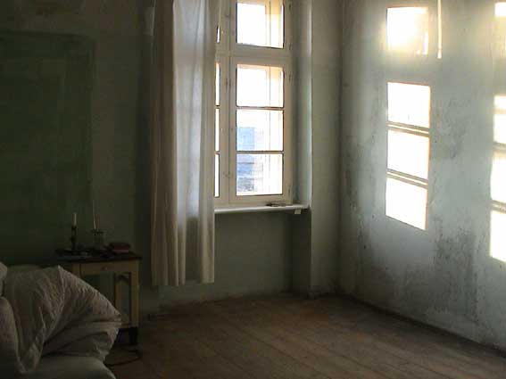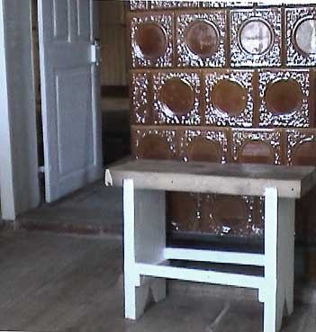 Tür zu, den Eingang wieder rechts vom Ofen und die alte Wand nach grünem Muster,