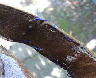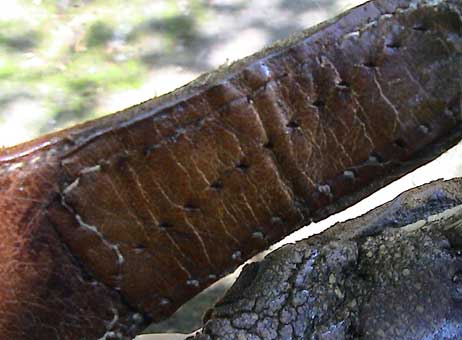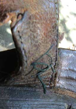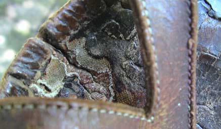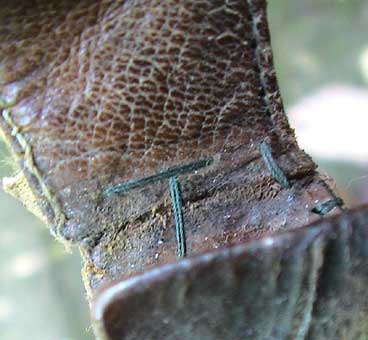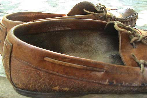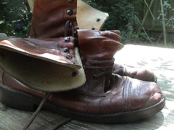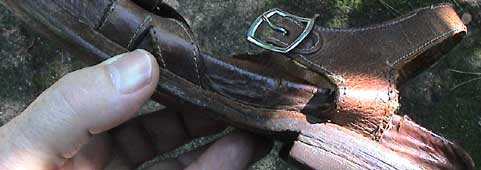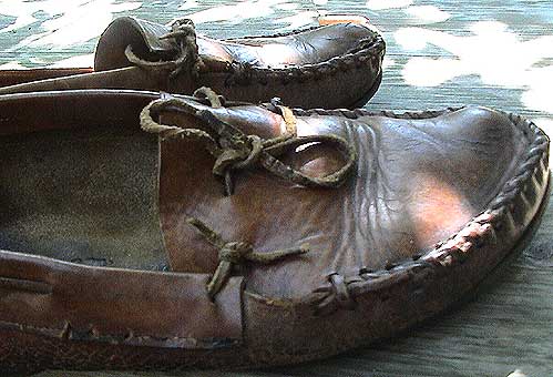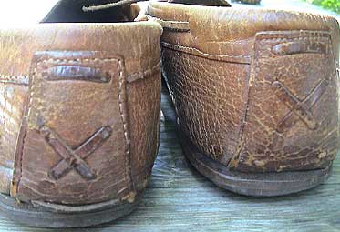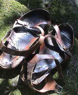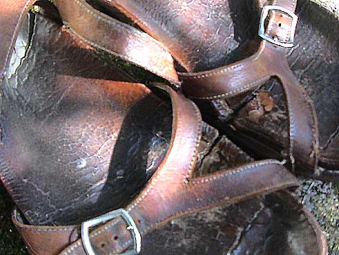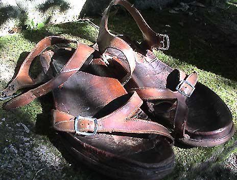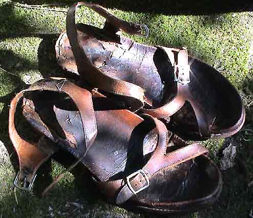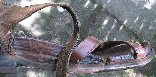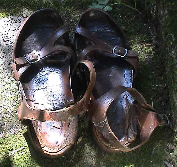 Wohl damals für die mühsamen Reisen in der Hitze brauchbar und wichtig, und bequem, im Fussbett aus Kork geut gehalten und geführt, sicher und leicht, luftig und offen. Gedanken über Fussbekleidung, darin dieser Schutz von unten mit Riemen das erste, und die Leder/Tücher von unten hochgewickelt. Noch früher und erhalten die von der Schwester selbst gefertigten Moccasins in Berlin 1950. Als ich sie wieder besuchte. Nach Nossendorf und dem Krieg. Und sie schon ein junges Mädchen war.