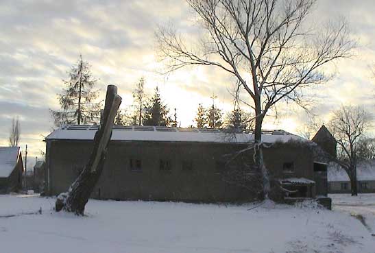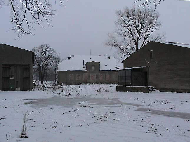 der Scheune eine gekalkte Wand und die Pfeiler am Eingang wieder.