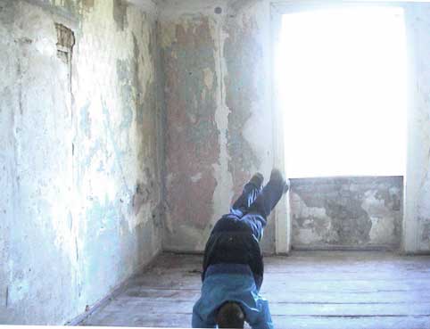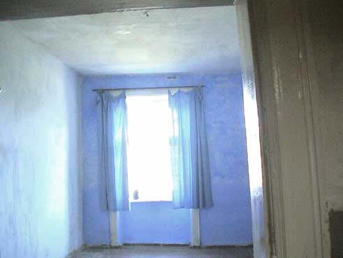 am Tiefpunkt seiner Existenz als Abbruchobjekt, mit den in Wände und durchs