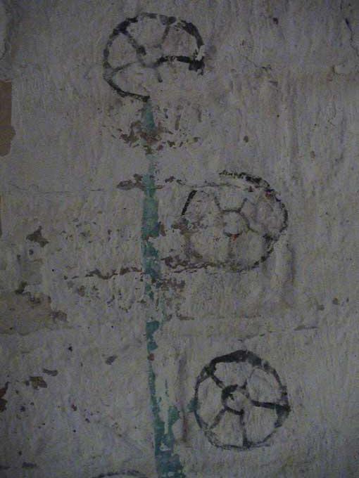Unter der letzen Fassung des 19. Jahrhunderts. Die mittelalterlichen Zeichen gehören zu einem wandfüllenden Wappen. Vermutlich polnisches Patronat. Wäre historisch für Pommern interessant.