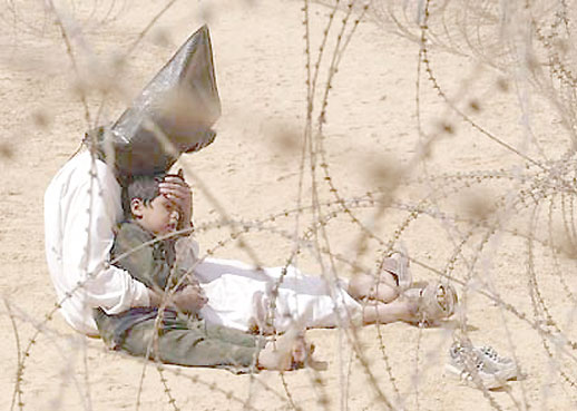 Ein irakischer Kriegsgefangener tröstet seinen vierjährigen Sohn.