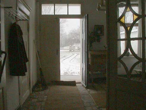 Haus uns Hof sind nun soweit, dass man sie benutzen kann. Sie müssen sich nun bewähren in neuen Dimensionen ohne den nährenden Acker mit den nicht mehr lebenden Tieren. So wie der Wiederherstellung aus Eigenem geschah, auch des Ortes und dieses Lebens Ernte, so müssen diese zeit , mit ihrer Technik und unseren Gedanken alles jetzt in Zuunft beleben. Die leere des Platzes ist eine Tat, denn vorher war da Fremdes.(Konsum und Garagen) und keine Abgrenzung , wie jetzt durch Gras und Mauern. Das Territorium ist abgesteckt. Die Bäume gepflanzt. Ob sie uns überdauern in dieser Zeit, wenn wir sie nicht mehr beschützen?