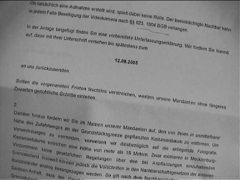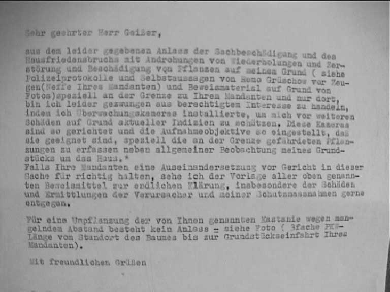 eigenen Grenze ab, von beschädigten Bäumen und Sträuchern die hier zur Diskussion