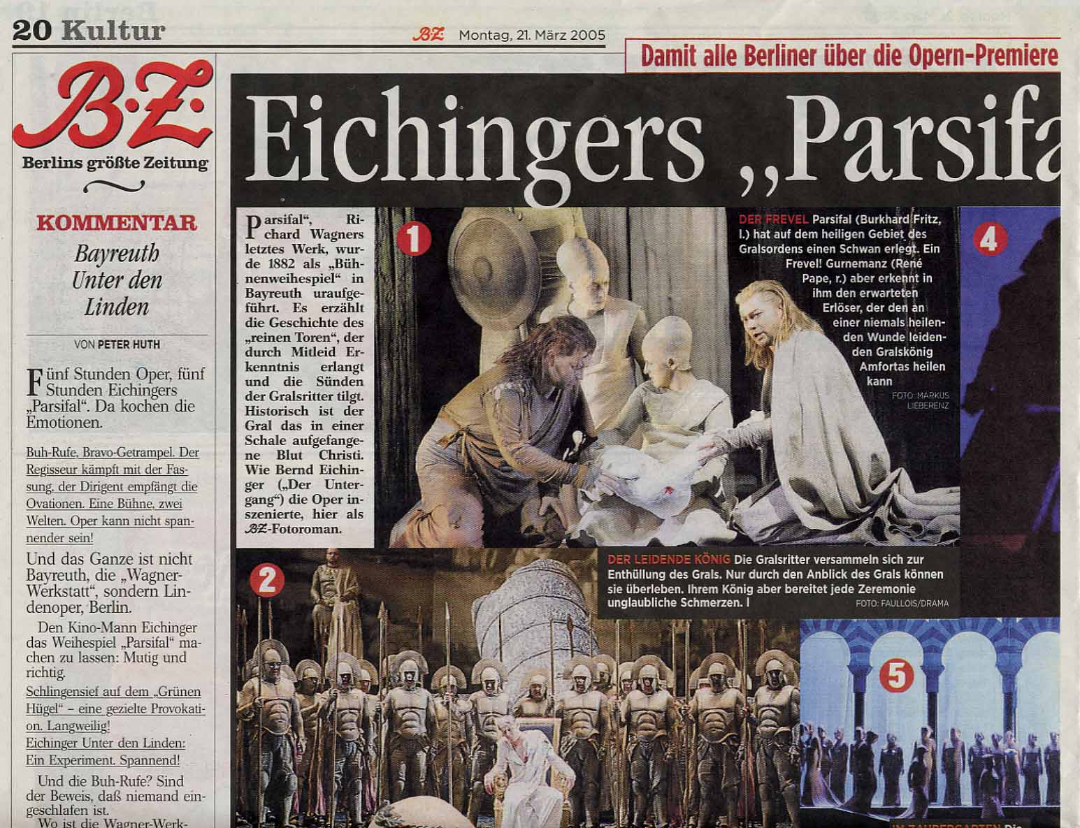 Viele Prominente waren zu Eichingers erstem Ausflug in die Opernwelt nach Berlin gekommen. Zu ihnen zählte der Bayreuther-Festspielchef Wolfgang Wagner, Ehefrau Gudrun und Tochter Katharina. Nur wenige Meter entfernt hatte der Regisseur Christoph Schlingensief Platz genommen, dessen skandalträchtige Bayreuther "Parsifal"-Produktion im vergangenen Jahr zu einem Zerwürfnis mit Festspielleiter Wagner geführt hatte. Beide hielten sich nach der viereinhalbstündigen Premiere mit ihrer Meinung zur Eichinger-Inszenierung zurück. "Ich muss noch zehn Tage darüber nachdenken", sagte Wagner.