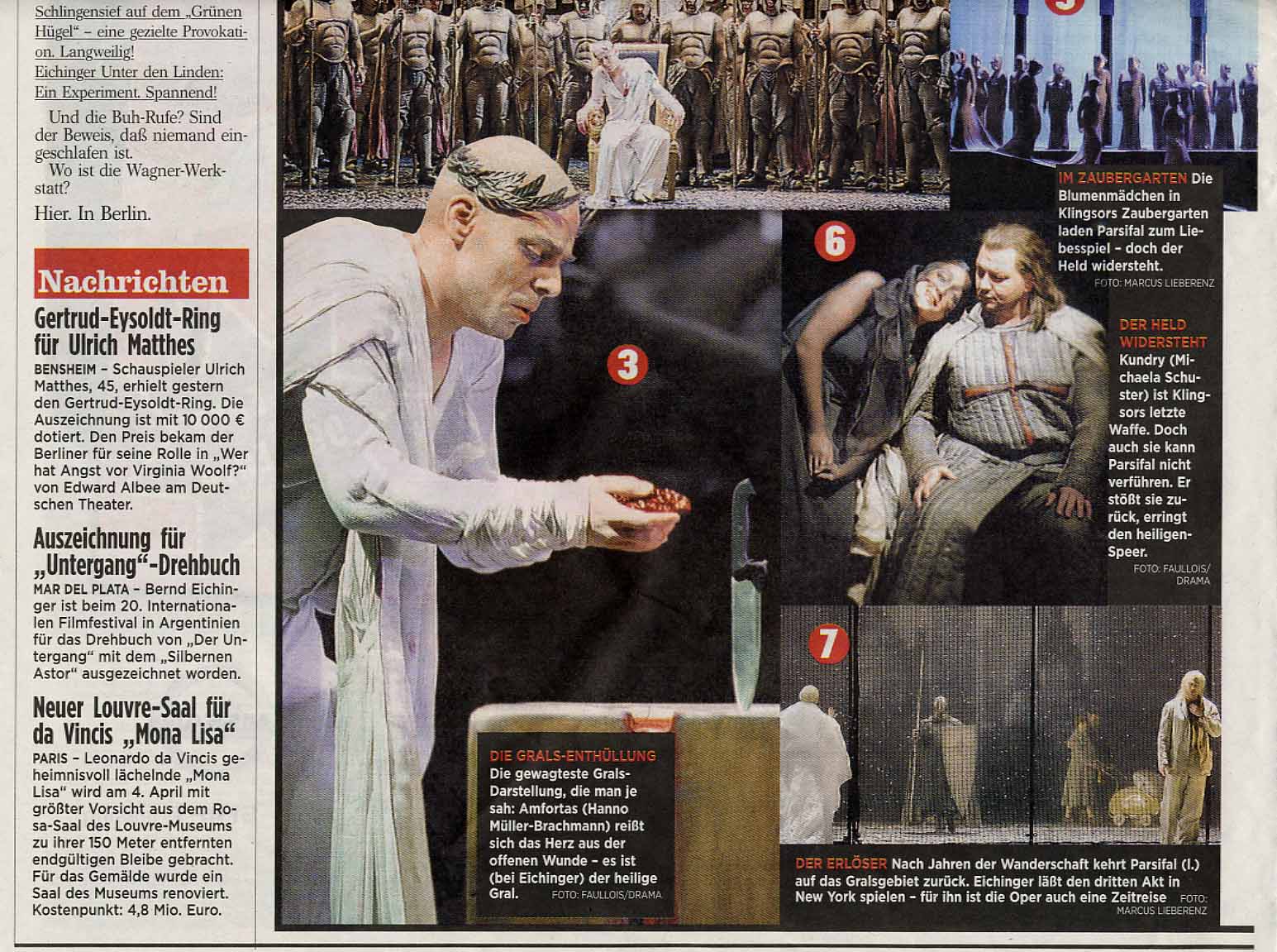 Die Szene ist erwartungsgemäß? hollywoodreif. Im Hintergrund: die Ruinen eines antiken Tempels, die Akropolis vielleicht oder Paestum. Davor, mit breit gepanzerten Brüsten: der Chor, das wackre Heer der Hellebardenträger. In deren Mitte wiederum: eine Art Nero oder Cäsar, irren, schmerzverzerrten Blicks, stöhnend, wimmernd, barmend auf seinem Löwenthron und sich alsbald den Lorbeerkranz vom kahlen Kopfe reißend. Amfortas, der Gralskönig, aha. Dessen Vater aber, Titurel, seinerseits ein rechter Bilderbuch-Römer, kennt keine Gnade: Enthüllet den Gral! Also greift sich der Sohn, dieses Inbild des Jammers, krampfend, röchelnd, hyperventilierend, in die linke Brusttasche und zieht ein glibbrig-rotes triefendes Etwas hervor: sein Herz. 750 Gramm frische Rinderleber, schätzungsweise. Nehmet hin mein Blut,/ nehmet hin meinen Leib, singen unterdessen die Knaben aus der Höhe. Richard Wagner, den Mythenverdreher aber das haben wir mit Nietzsche und Bernd Eichinger ja schon immer gewusst , graust es vor gar nix.