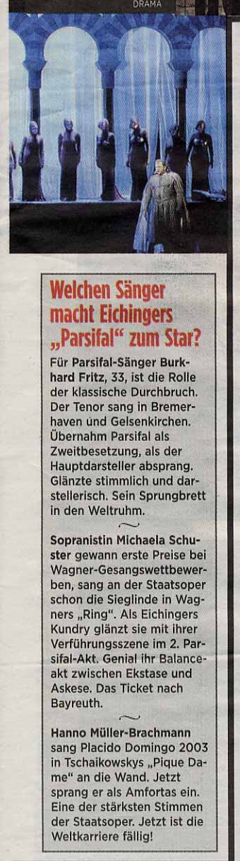 Die Sänger jedenfalls genossen ihr uneingeschränktes Rampendasein und sangen auf hohem Niveau: René Pape einen mühelos textverständlichen, sehr sonoren, leicht künstelnden Gurnemanz, Hanno Müller-Brachmann einen arg lyrischen, jeden Vokal mit Bitternis aufpumpenden Amfortas, Jochen Schmeckenbecher einen markigen Klingsor, Burkhard Fritz einen beherzten, erstaunlich konditionsstarken, leider sehr unvorteilhaft kostümierten Parsifal, Michaela Schuster eine ziemlich erotische, auch letzte dramatische Höhenkräfte sicherlich noch gewinnende Kundry und Christof Fischesser einen rollengerecht ungerührten Titurel.