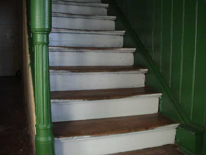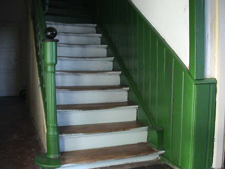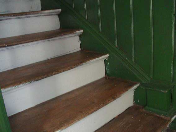 Haus die Treppe nun mit weissen Brettern der Blenden zum Braun der Tritte von