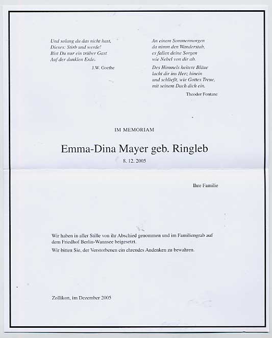 Emma Diana Mayer gestorben. Am 8. Dezember, den sie noch gross vorbereitet mit Fragen und Vorkehrungen für Nossendorf, was sie alles mitmachte aus der Ferne. Nach dem Hitler-Film in Aschaffenburg zur ersten Aufführung in Deutschland im geschlossenen Kreis, organisiert von G.Knopp ZDF, rief sie mich an.