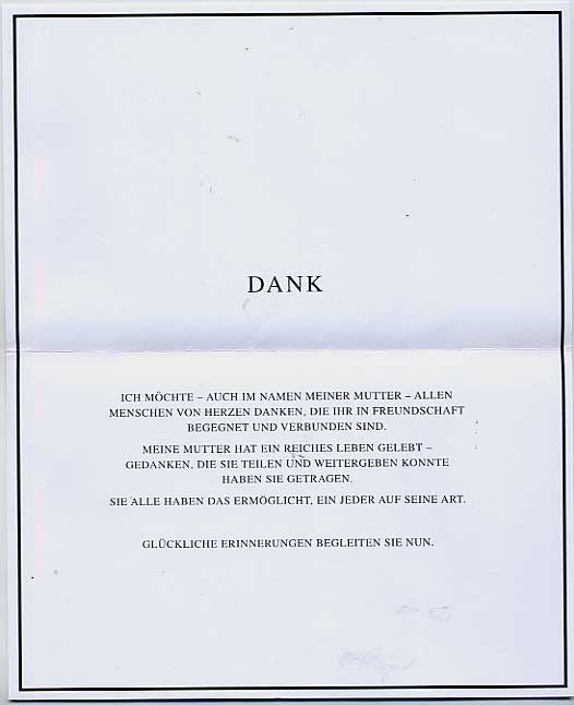 Seitdem war sie eine treue Zeugin aller Auftritte im Theater der Monologe in Frankfurt, wo sie wohnte, Allein, ohne Mann und Sohn, tapfer und mit berliner Witz. Nun ist sie nicht mehr da. Das Alter lässt keine Tragik zu, Aber, wie immer, Gedanken, was alles versäumt wird, unwiderrufbar nach dem Ende. Die neue Ausgabe der Faust DVDs in Paris hätte sie gefreut. Ihre alten Bekannten zusammen zu diesem Text. Die Schinkelvase, die sie noch zum Sommer nach M. schickte, ist nun für sie gebraucht. Der Stuhl aus gleicher Herkunft soll nach N. Ob sie meine Karte noch erhalten: zum 8 Dezmeber N. vorher/Nachher. Ihre Antwort war die ihre. Mehr ging nicht.