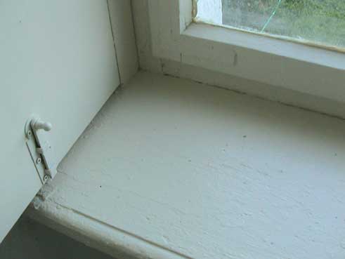 Fensterbrett ist alt noch mit den Spuren der Jahre, die Läden neu, zum Schutz