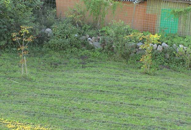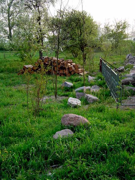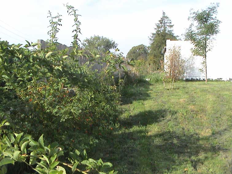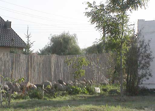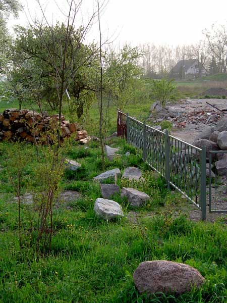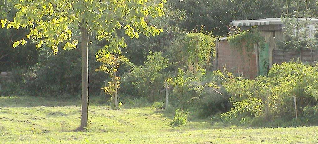 Auf ein Grundstück, dass verstellt ist von eigenen Hütten und