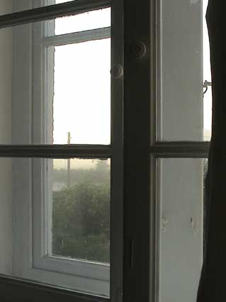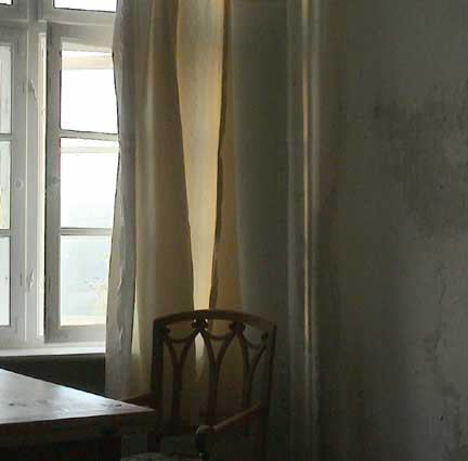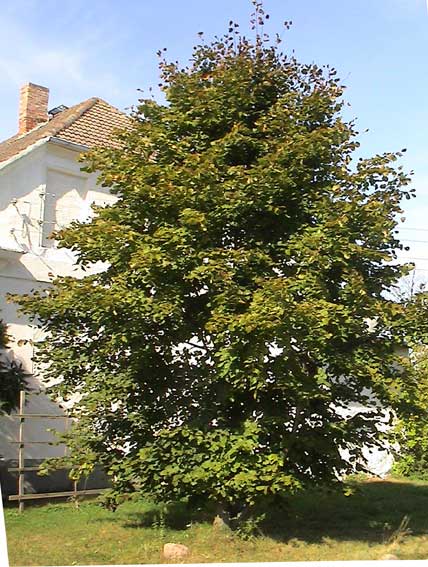 Linde vor den Fenster am Giebel, auf die die Kamera gerichtet sind. Das ist