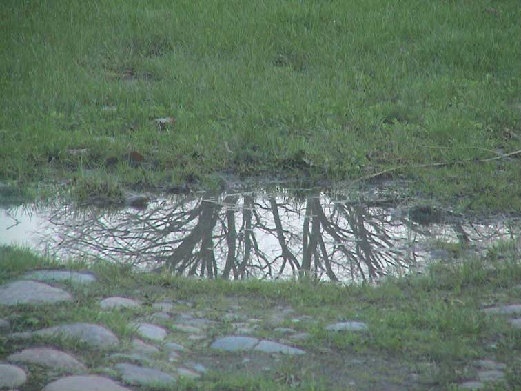 Vogeltränke ist schon bereit, die Äste noch kahl .Der Abend.