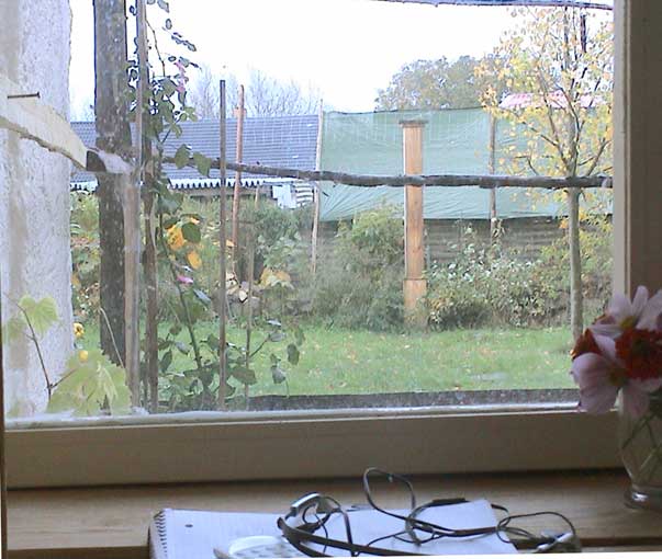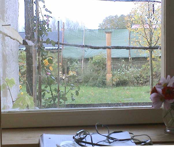 Dieser Ort und diese Stelle nämlich ist zu Masstab aller anderen geworden. Dessen, was bewältigt und geheilt wurde und was behindert und wie Produktivität verunstaltet wird.(Bild7).Darum muss, wenn schon aufgerufen, das Gericht meine ich hier für Ordnung sorgen und nach dem Gesetz der durch die Realitäten gesetzten geistigen Hintergründe auch der produktiven Aktiviäten und nicht nach Formalien, die die anderen arglistig und offen unterlaufen, urteilen. Schon kündigt der Nachbar neue Eingriffe an, als meine Leute nun versucheten die Grenze mit Schutzmassnahmen(Bild 8) für das Augen zu befestigen(die haltenden Sturm-Seile der Wände abzuknipsen), und wir werden sie wieder woanders befestigen, wo der nicht hinkann. Ein Vergleich ist unter diesen Umständn nicht möglich. Die Kosten liegen bei mir, nämlich den Einblick zu armieren, und so dass es nicht wehtut. Das gehöhnte Gericht aber und alles damit habe nicht ich zu verantworten.Und schon gar nicht meine Bank. Der Natur dieser Nachbarn gemäss werden die Bäume an der Grenze wieder vergiftet werden wie schon Ilex, Thuje und Kiefer, wird der Zaun beschädigt werden und werden sie sagen, man schaue hinein, sie an. Und ich werde nicht müde werden, alles wieder zu befestigen, kultivieren und retten. Aber es darf nicht sein, zu sagen, nun seid mal nett jeder muss was nachgeben im Vergleich, vor allem von Seiten dessen,der solcherart geschädigte, und jeder zahle seinen Teil und geht nach Hause, in drei Wochen ist der Urlaub vorbei und das Urteil fertig.