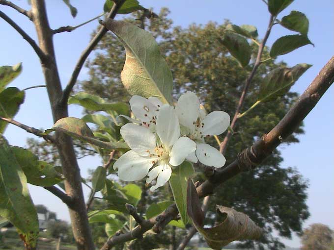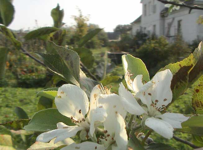 im Oktober nochmal der Apfel(Hasenkopp) in voller Blüte. Das Blühen neben schon welkenden Blättern.