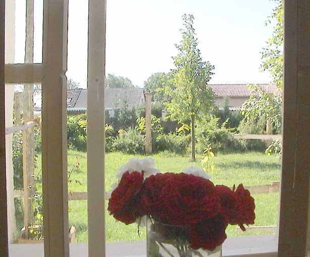 den Rosen und Stäuchern und Bretterwänden , mannshoch, und Koniferen 3 Meter