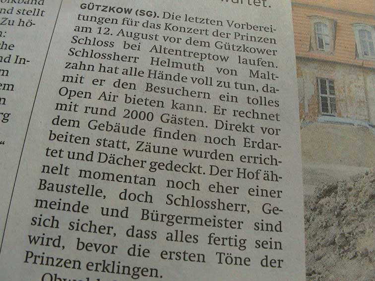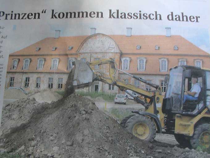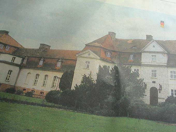 der alten Würde.Dahinter die Kirche des ehemaligen Klosters, ausgebrannt und