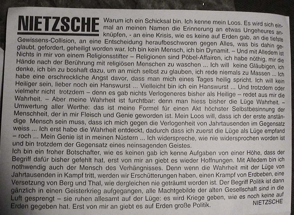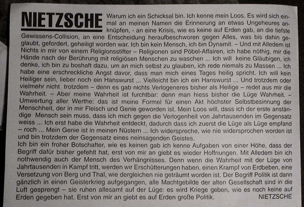 den Nietzsche Schleefs tun, dass die Brüder im Blute zusammenkommen