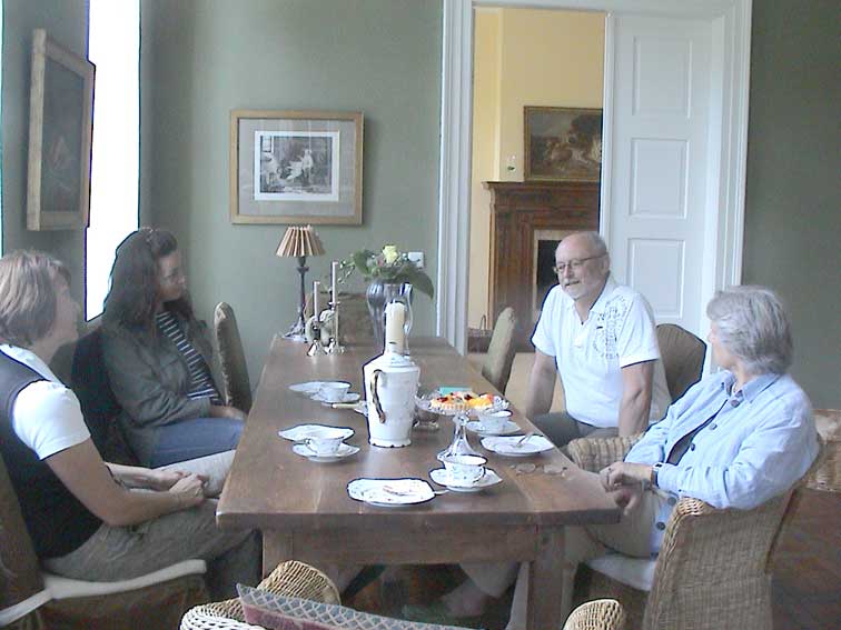 auf der Terrasse vor dem Haus mit der Perlhühner "Glock-acht". "klock-acht"