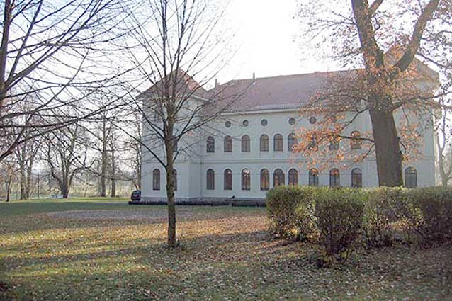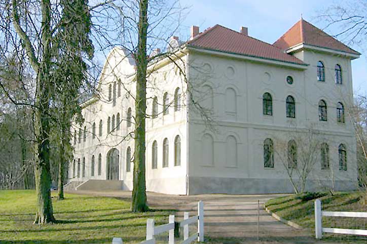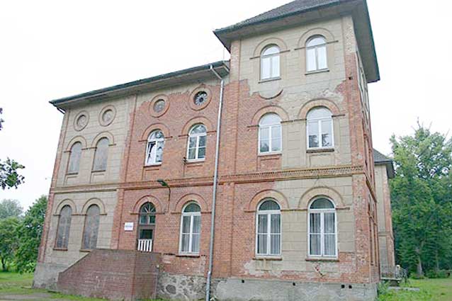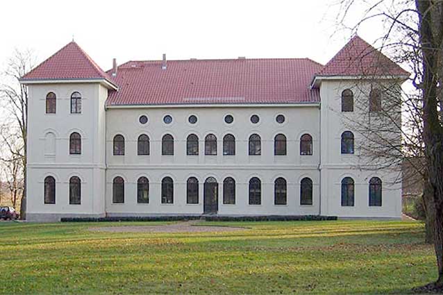 das Gebäude. Der Mittelrisalit zur Dorfseite hin ist durch einen bewegten