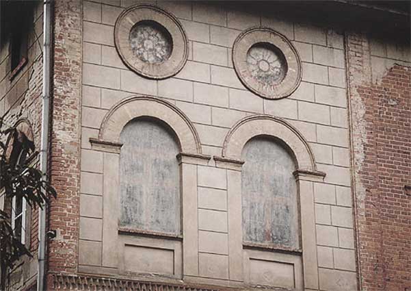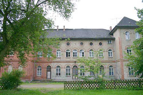verputzter Backsteinbau. 13 rundbogig ausgebildete Fensterachsen schmücken