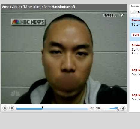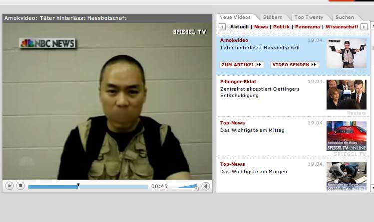 Damit kein Irrtum aufkommt.Der ungebeten ins Haus täglich einbrechende Ausverkauf der Mädchen, wie er gestern geszeigt wurde, ist nicht von gleicher Art und Gewichtung hier wie die Tat des Büchner-würdigen Video-Statements vor dem Tode aus Virginia/Blackburg vor dem Tod, sondern sie stehen einander abhängig gegenüber. Wie anders kann einer mit der Sensibilität eines aufmerksamen Jungen auf diese Welt anders regaieren als sich an Kreuz genagelt fühle der Menschen, die das ertragen verursachen. Dass es einer ist aus nicht-amerikanisch-europäischem Geschichtskreis ist traurig. Er tuts für uns, wie die des 11.September, die so viele Opfer mitnehmen mussten, um die Welt vor ihrem Untergang zu sensibilisiern.