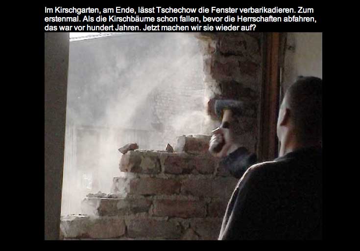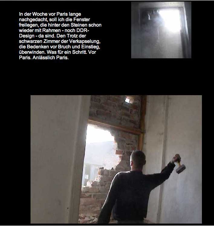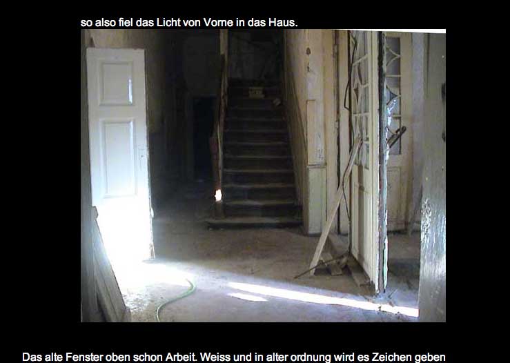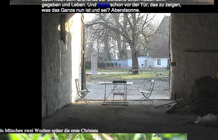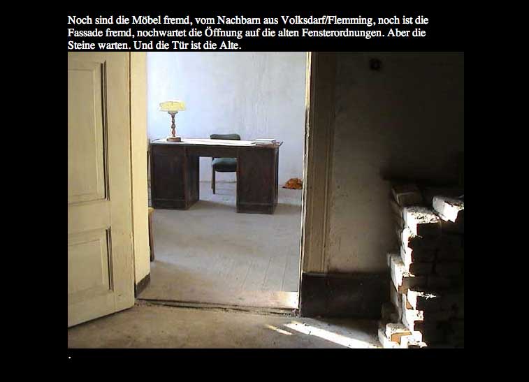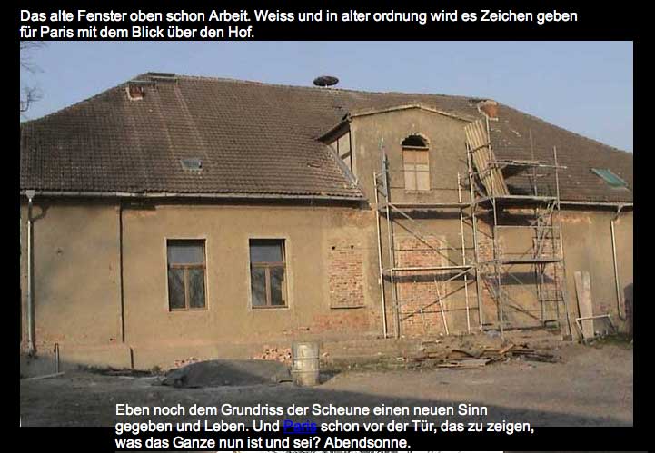 Nur die LPG Halle -an der Stelle der ehemaligen Scheune und einzig übrig geblieben von allen Gebäuden des Hofes, neu verkalkt- war damals in Betrieb für Projektionen aus Paris und als Ort aller. Logisch nun der Ort der Kultur. als Halle statt des Gutshauses. Wie verdächtig erschienen mir alle Übungen in den Städten auf den Theatern und in sonstigen Events angesichts dieser Vorgngänge und Menschen. Noch hier im Buch von alledem fliegt es nun raus und kommt gar nicht erst vor.