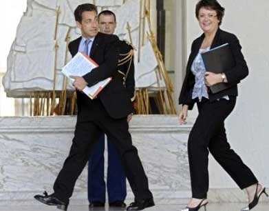 Sarkozy zu sehen, der einen Aktenstapel unter dem Arm trägt, auf dem ein