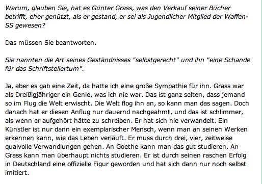 Nun, so einfach ist das nicht. Auf zweitem Blick kommt nun ein anderer heraus. Ein ganz anderer. Jedenfalls als der er in den Augen aller sich gab. Als wir ihn sehen sollten. Oder war es immer derselbe und wir sahen es nicht. Alle der Generation. Plötzlich. Einmal dabei immer dabei. Nur unter anderem Vorzeichen. Wie werden sie dann den verfolgen, der nicht mitmacht. Las gestern Manager mit Charakter gesucht. Was für ein altes Wort. Im alten Stil würde Beckett sagen, auf dem Abfallhaufen. Gelächter. Das ist es wohl. Auch im Abbilden der Welt, ob innen oder aussen. Charakter der Texte, Bilder, Installationen, Musiken.