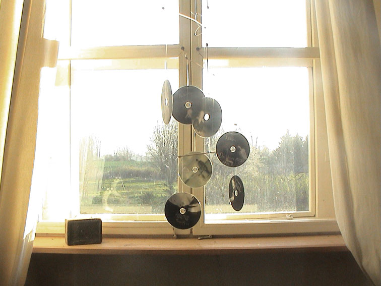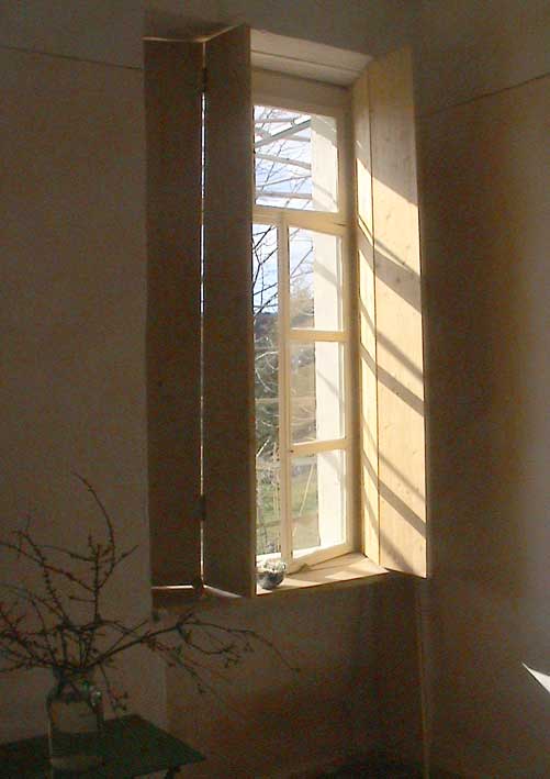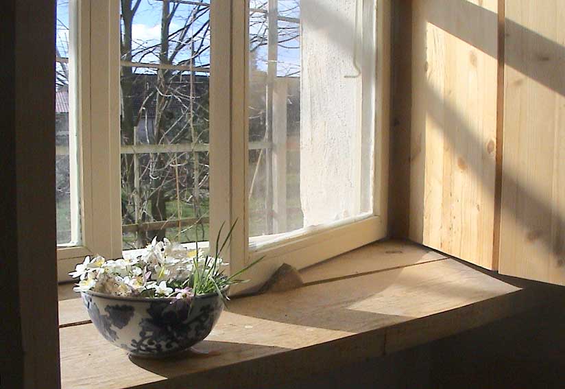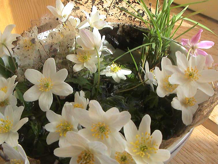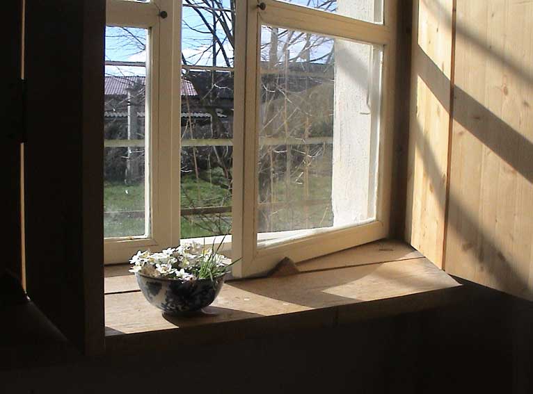 das, ein Fenster mit Sonnenlicht hinein noch ohne Laub die Schale mit Frühlingsblumen