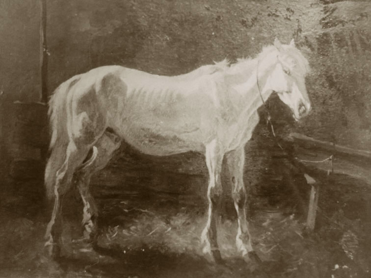 sagt uns dies kleine Bild von einem Pferd, lahm und abgemagert, Klepper oder