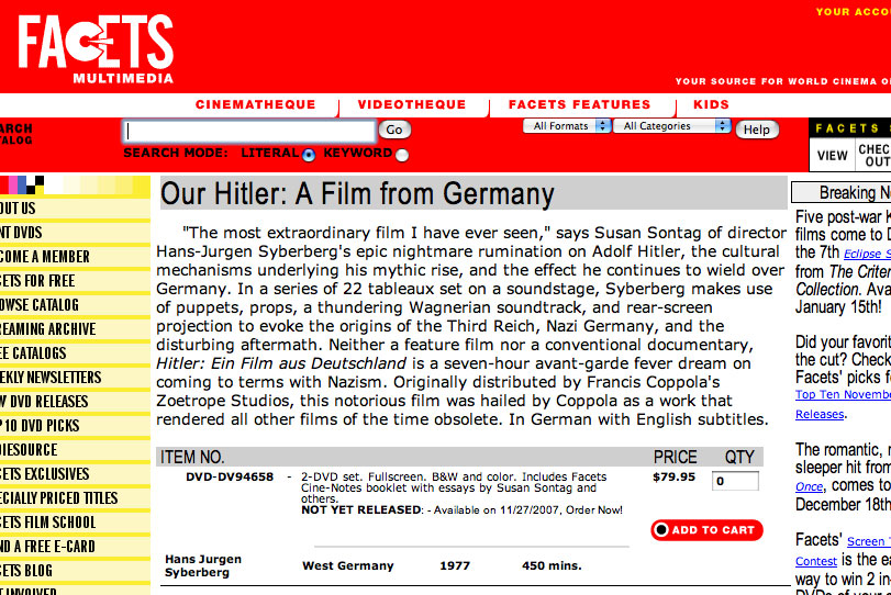 Facets will release Hans-Jurgen Syberberg's "Our Hitler: A Film from