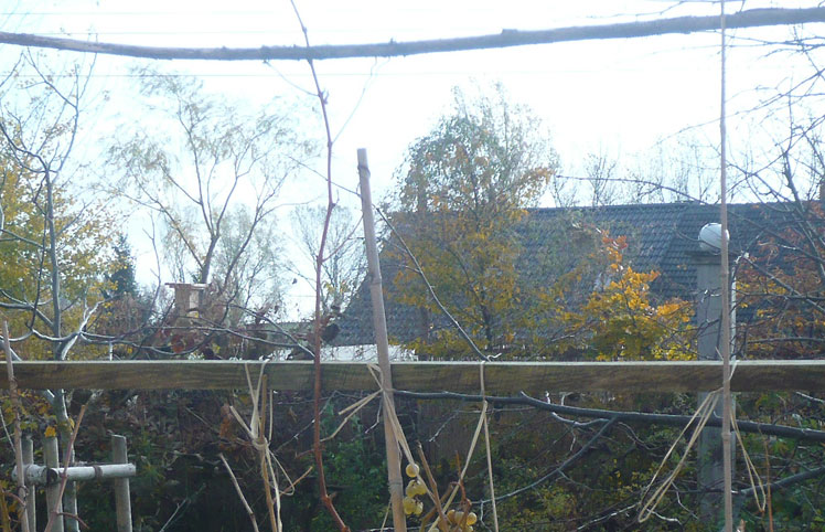3 Hainbuchen, einzige noch mit Laub über den Winter, und eben erst gepflanzt,
